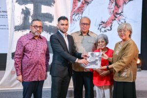 Dr. Chung Yi, representing the family of the late Chung Chen Sun, together with Mrs. Lee Soo Lin, the late artist’s wife, presenting the Archive Project: Chung Chen Sun exhibition catalogue to YB Datuk Khairul Firdaus Akbar Khan.